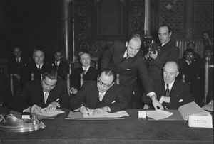 Kusainiwa kwa Mkataba wa Mkutano wa Jedwali la Duara kati ya Indonesia na Uholanzi mnamo 1949 kuhusu Utambuzi wa Ukuu wa Indonesia.